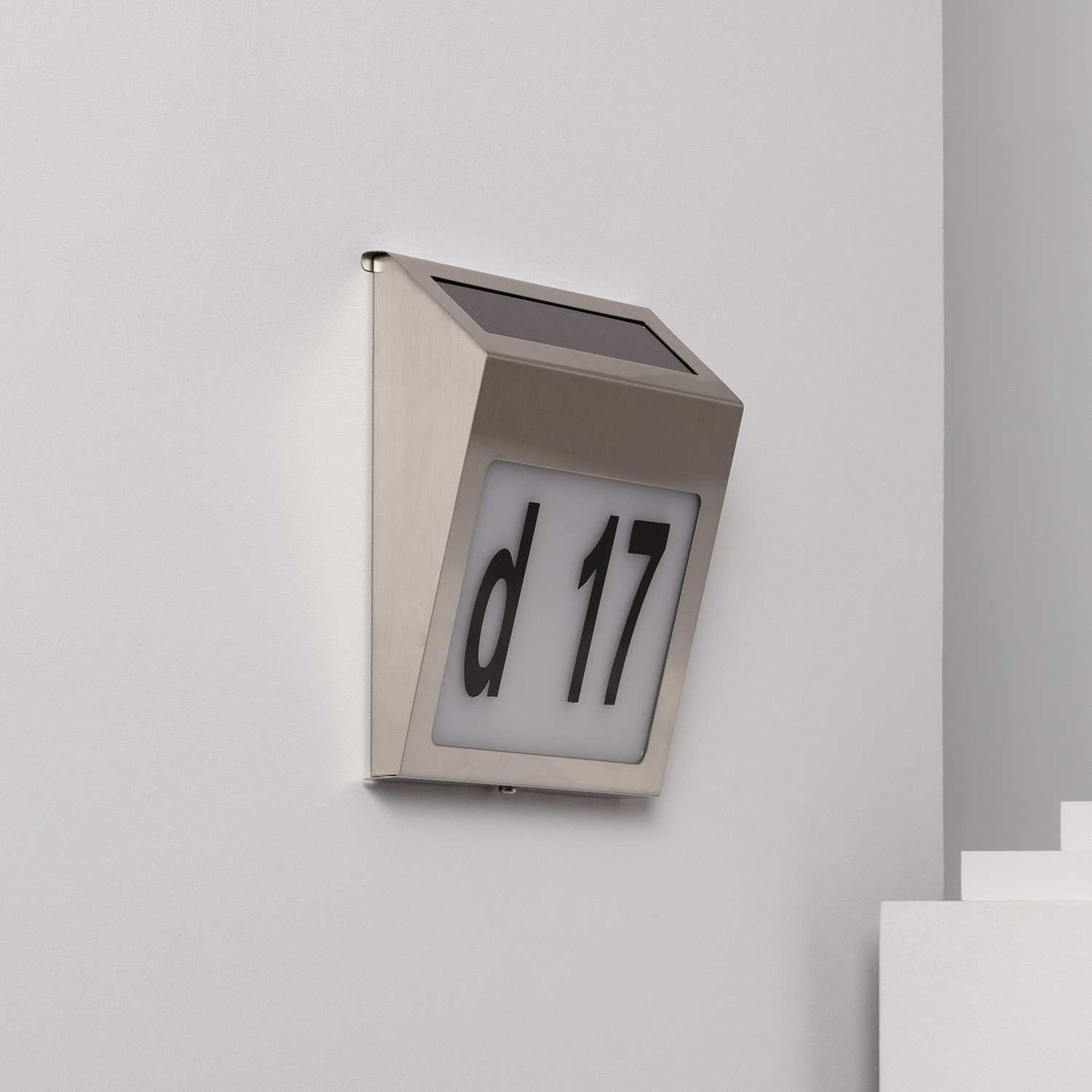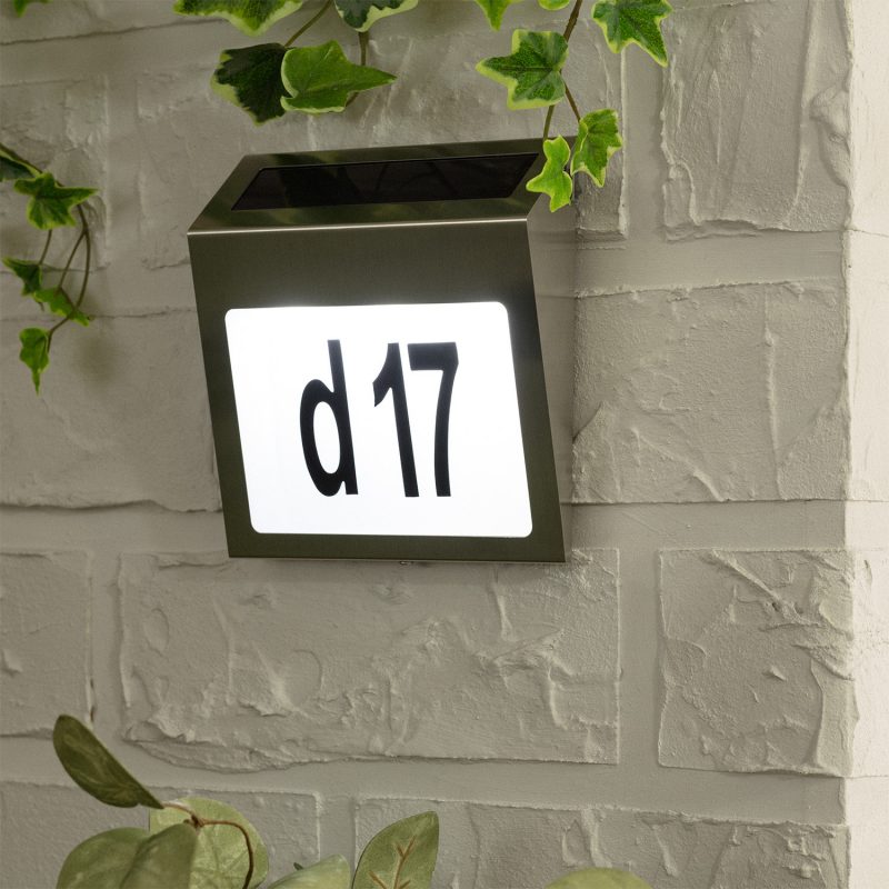 Il numero civico da Parete è perfetto per creare ambienti esterni eleganti e altamente personalizzati. E’ dotato di un pannello solare che permette di ricaricare la sua batteria in modo che non abbia bisogno di essere collegato alla rete elettrica, quindi non è necessario nessun collegamento elettrico.